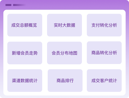包含多个数据板块:成交总额概览、新增会员走势、渠道数据统计、商品排行、支付转化分析、商品转化分析、成交客户数据统计等。